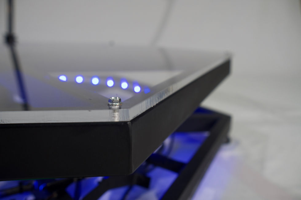 Plataforma 360 Photo Both modelo TOP Glass, com LED RGB ligado na cor azul.